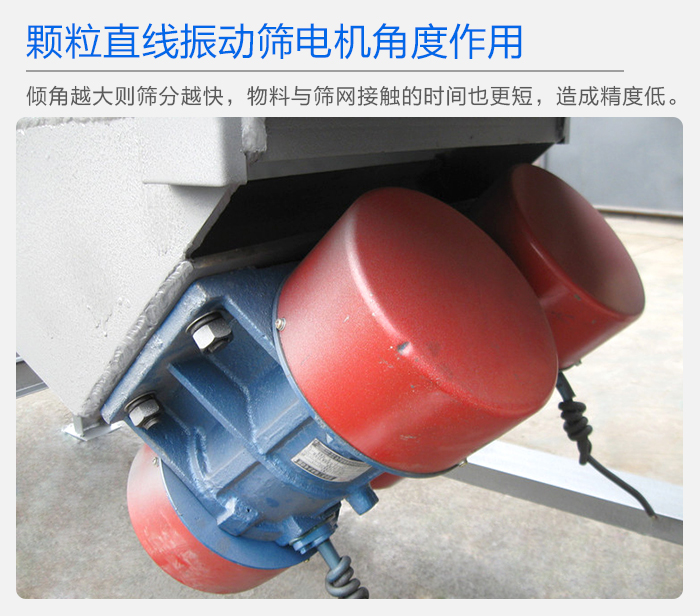 顆粒直線振動篩電機的安裝角度是可以調(diào)整的,角度不一樣,其產(chǎn)生的振幅大小也不一樣,一定傾角的直線振動篩,可以有效的提高篩分產(chǎn)量,增大生產(chǎn)效率,傾角越大,則篩分越快,物料與篩網(wǎng)接觸的時間也更短,則篩網(wǎng)使用年限也會增加,角度過大。則容易造成篩分精度達(dá)不到,影響篩分質(zhì)量,所以顆粒直線振動篩的振動電機在安裝時,角度的選取很重要,客戶在開機使用直線振動篩前,應(yīng)根據(jù)生產(chǎn)需求,調(diào)整好角度,一般直線振動篩廠家在篩機出廠前,將其角度調(diào)整為45度。